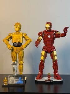 LEGO C-3PO display set next to LEGO Iron Man Mark 3 Collector’s Edition